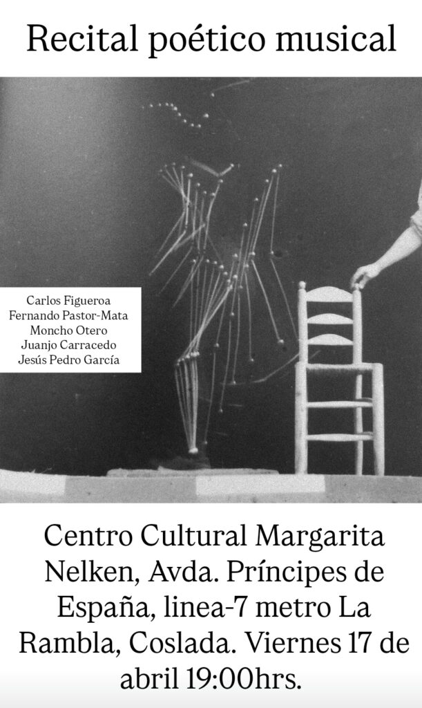 El viernes 17 de abril de 2026 a las 19:00h participaré en un recital poético musical en el Centro Cultutal Margarita Nelken en Coslada.